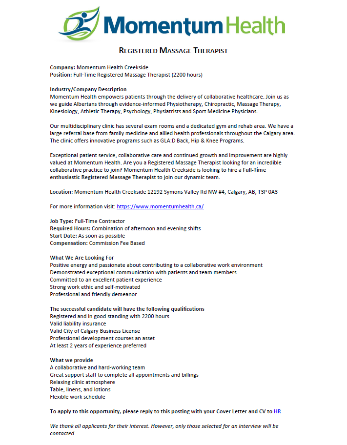 Massage TherapistBy Krysanna Graham / March 20, 2026 12192 Symons Valley Rd NW #4, Calgary, AB, T3P 0A3 Posted 2 weeks ago Website Momentum Health Creekside To apply for this job email your details to hr@momentumhealth.ca